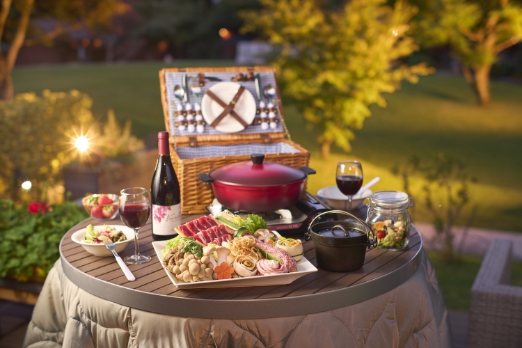 本プランのご夕食は、プライベートテラスのコタツ付きダイニングで味わう鍋料理やブッフェ、国産牛のすき焼きコースなどをご用意しています。ご夕食後に、ランタンイベントへご案内いたします。