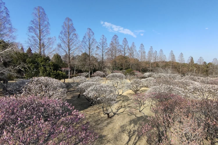 リソルの森のエリア内に広がる梅園は、約7,000坪もの開放的な空間に、蝋梅、紅梅、しだれ梅、豊後梅、白加賀梅、野梅、緑縁梅など多彩な品種、約450本の梅の木が咲き誇る、関東屈指の梅の名所です。例年2月中旬から3月中旬にかけて見頃を迎え、今年は年明け早々から可憐な花がほころび始め、ひと足早く春の気配を届けてくれています。