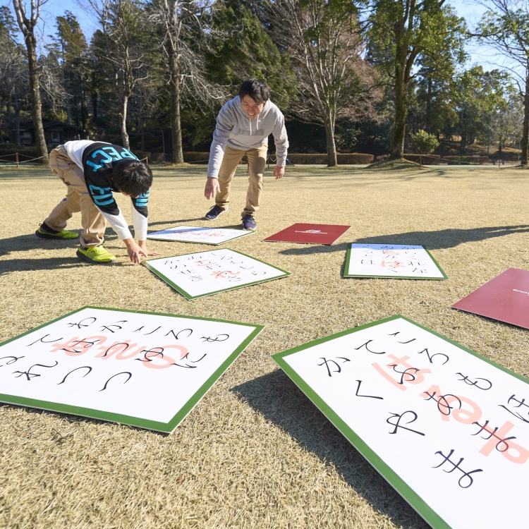 大きなかるた札を使って楽しむ「ジャンボかるた大会」を開催いたします。梅園の芝生に置かれたジャンボサイズのかるた札の中から読み上げられた札を探して、走って、取って、みんなで盛り上がる体験型かるたです。全日本かるた協会の方をお招きし、読み手やルール説明を行っていただきます。小さなお子様も一緒にお楽しみいただけます。