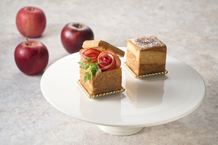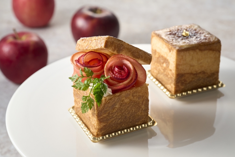 今季のキューブシューは、りんごの果物言葉をそれぞれのシューで表現しています。<選ばれた恋>をイメージした、アップルローズでロマンティックに仕上げた「TAMATEBAKO」と、<永久の幸せ>をイメージした、キャラメリゼしたりんごとカスタードクリームを包み、表面をブリュレ風に仕上げた「SAIKORO」の2個セットです。