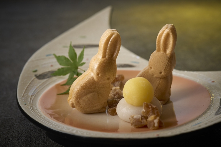 愛くるしいうさぎとお月様に見立てた柚子団子のミニデザート。もなかの餡は、おさつバターとチーズクリームの2種をご用意しています。