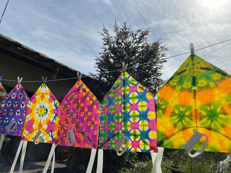 凧づくりは、土岐氏が開発した空高くまでよく揚がる凧キットを使い、伝統的な折り染めでお好みの色合いに和紙を染め、その和紙を使ってオリジナルの凧を作ります。