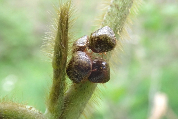 5mmほどの小さいカメムシです。マメ科の植物の汁をすって生活しています。秋になると冬眠する場所を探すために家のカベや洗濯物についてしまうちょっと迷惑なカメムシです。