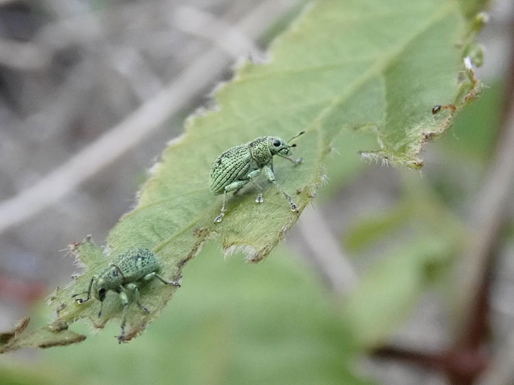 緑色の粉におおわれている1㎝もない小型のゾウムシです。5月から8月ごろの晴れている日にクズの葉っぱの上にたくさん歩いているのを観察できます。