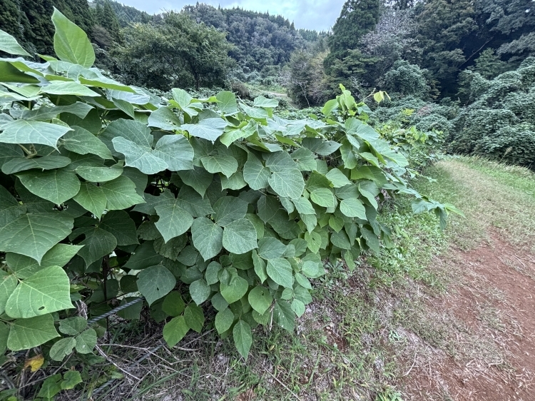 マメ科の仲間でつるをのばして成長します。成長スピードがとても速く、1日で30㎝から1m近くのびることもあるそうです。日本各地でよく見かける植物で、根っこの部分を葛餅(くずもち)や葛根(かっこん)など食用や薬用で使用されています。リソルの森内ではスカイバレーや第一グラウンドなどに生えています。