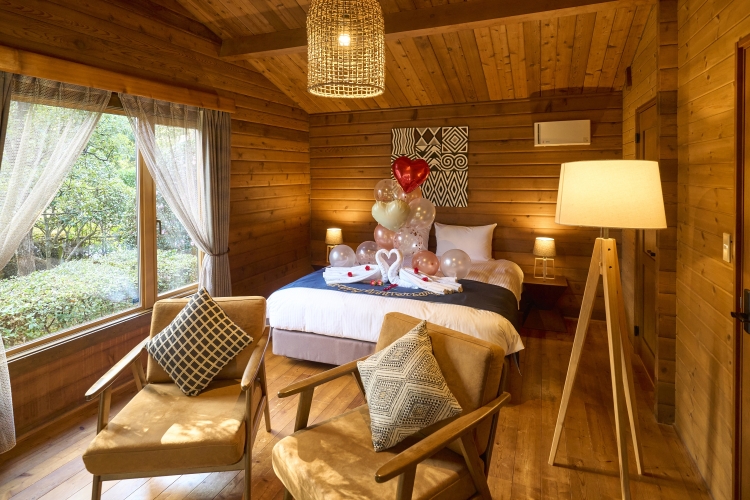 本プランでご案内するお部屋は、バレンタイン・ホワイトデー特別仕様で白鳥のタオルアートやハートのバルーンでデコレーションしています。グランヴォー スパ ヴィレッジの「テントキャビン」か「テラスハウス」からお選びいただけます。「テラスハウス ダブル」は、キングサイズのダブルベッドをご用意しており、カップルにおすすめです。
