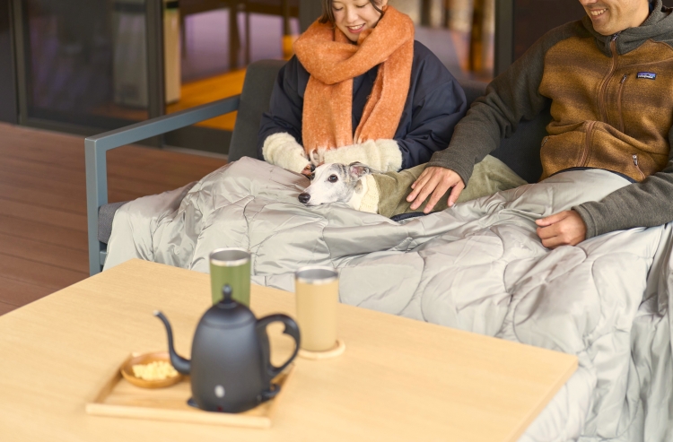 2025年11月1日(土)から3月15日(日)までの期間、リソルの森の愛犬と泊まれるプライベート温泉付き宿泊エリア『ディア ワン スパ ガーデン』では、全棟のヴィラに愛犬と一緒にぬくぬくと温まれる「こたつ」をご用意しています。