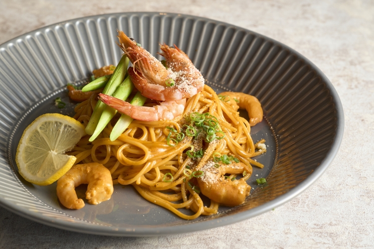 新メニューとしてご用意した「海老と完熟トマトのビスク風クリームパスタ」は、濃厚なビスクソースを絡めたパスタに、さっぱりとしたレモンオイルをかけて仕上げています。レモンの軽やかな爽やかさを感じられる芳醇でリッチな味わいのパスタです。