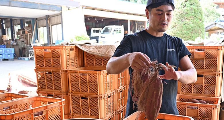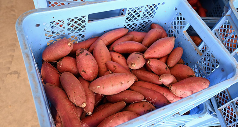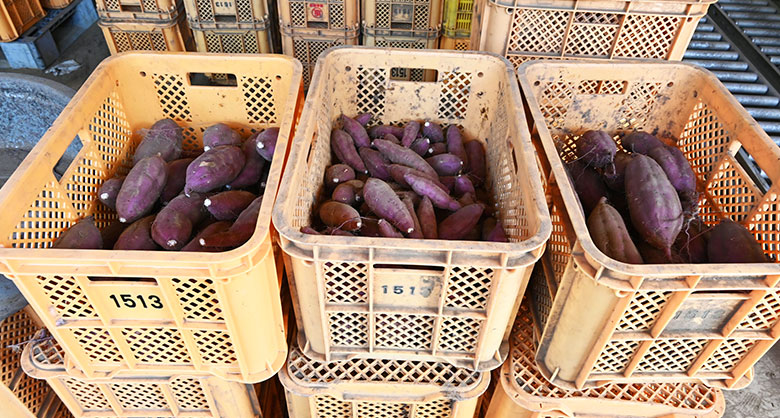 8~11月はさつまいもの収穫期。2~4月に育苗した40万本におよぶ苗は、春から初夏にかけて1本ずつ手で植えられていきます。ひとつの苗に3~10本のさつまいもがなり、数百万本(約400t)の収穫量になるそうです。収穫したさつまいもは、泥を落としてサイズごとに分別。毛や芽をとり、ひげの部分を切り分けた“生”状態で出荷するさつまいも以外は、甘く熟成させるために貯蔵庫へと運び寝かせます。