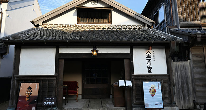 蜜芋洋菓子店「金蜜堂」。小野川沿いには築100年を超える商家や町屋などが軒を連ねる。