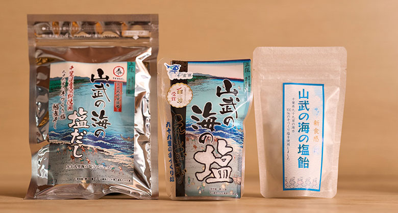 左から)山武の海の塩シリーズ「塩だし」「塩むすび」「塩飴」