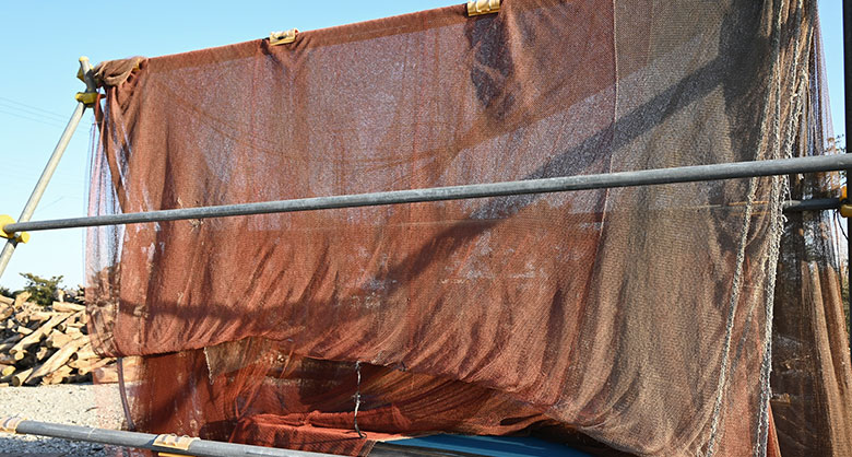 漁網を利用した「流下式採鹹」。網に海水を垂らし、水分をとばして濃縮させることで熱源である薪のコストを減らすことにもなる。