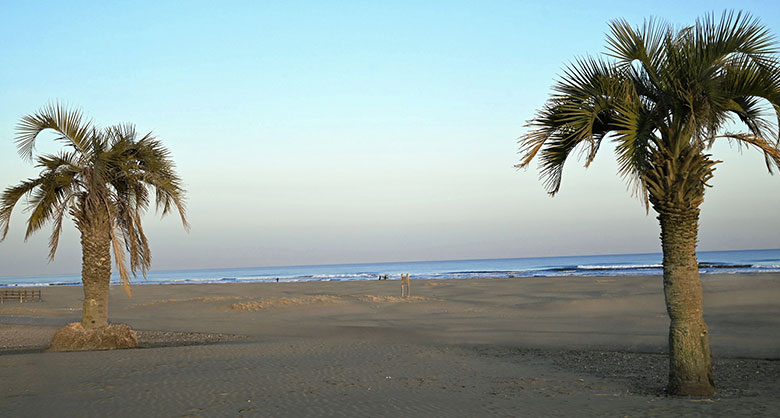 約500mの広大な砂浜と約30本のヤシの木が特徴の「本須賀海水浴場」。